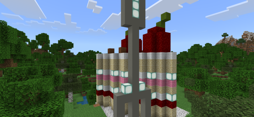 Постройка «Дом-торт» — это креативная постройка, выполненная в виде торта. Она сочетает в себе элементы архитектуры и сладкого десерта, создавая атмосферу праздника и веселья в мире Майнкрафта на телефоне.