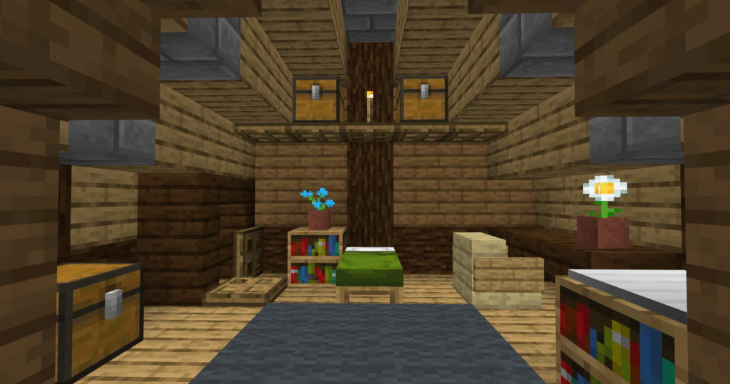 На чердаке расположена кровать с сундуками и книжными полками, что делает дом более уютным для окружающих.