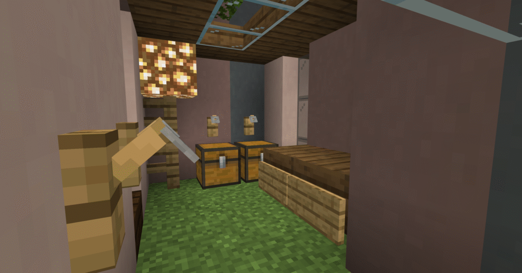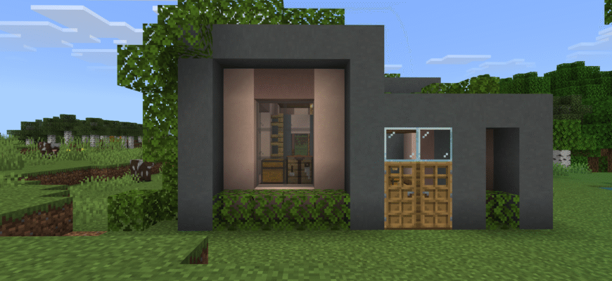 Постройка «Интересный домик» представляет собой уютное жилище, для кубической вселенной Майнкрафта на телефоне, которое выполнено в минималистичном стиле и не нарушает игровой баланс.
