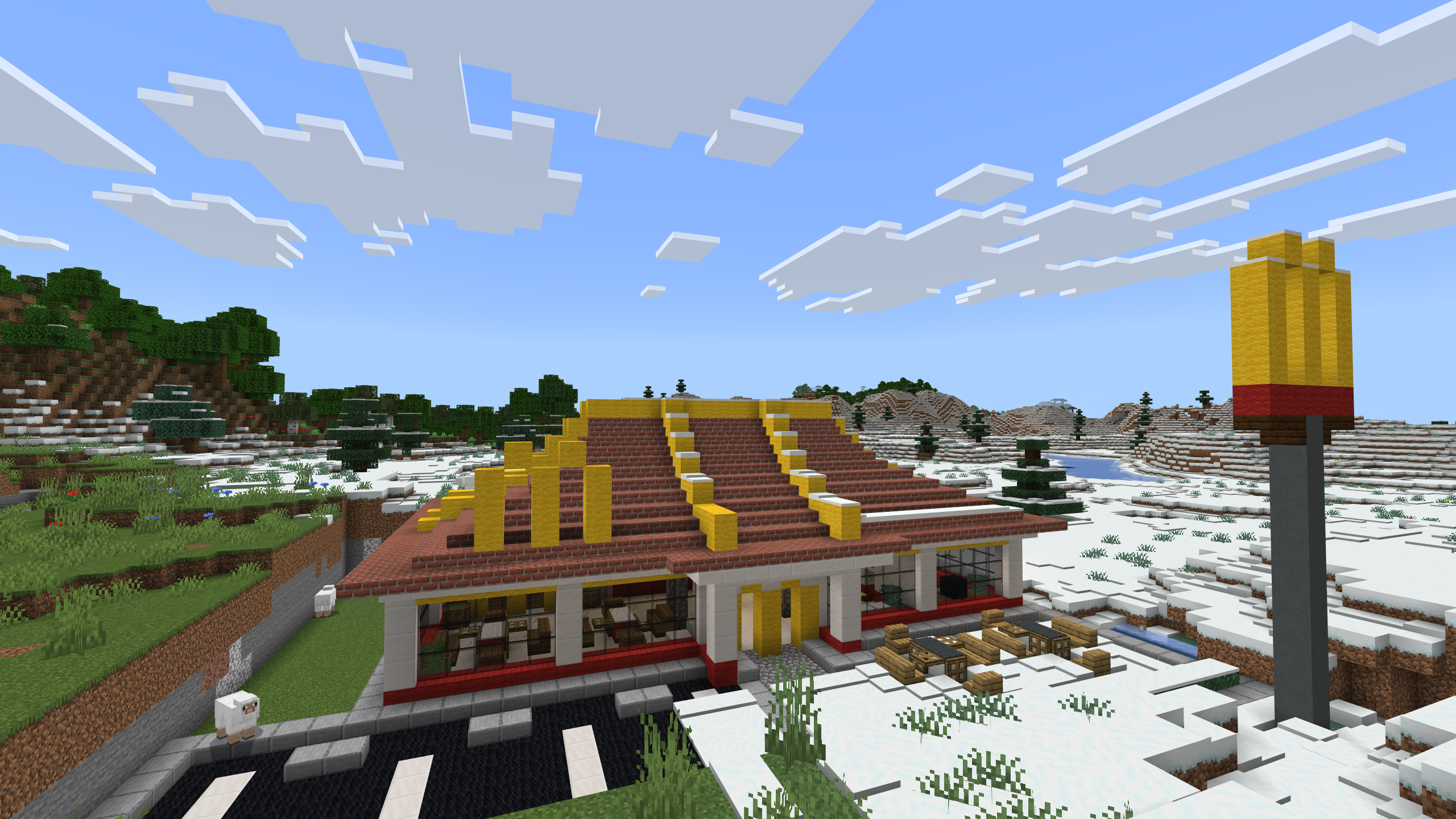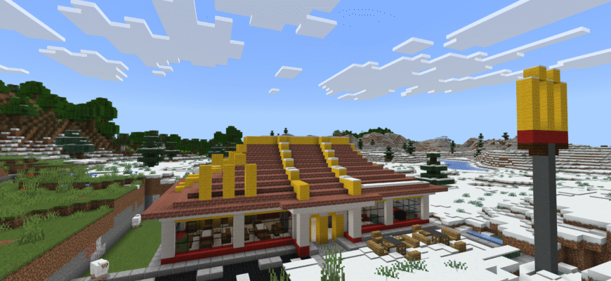 Постройка «Макдональдс» – это сооружение созданное по мотивам всем известного Мака, но уже в Майнкрафт на телефоне! Теперь вы можете посмотреть изнутри, как работает эта система и вкусно покушать в кубической вселенной.