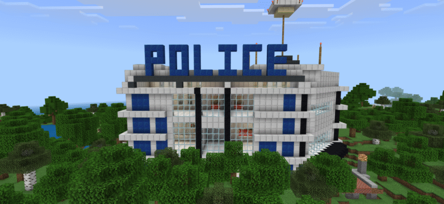 Постройка «Полицейский участок» представляет собой детально проработанный полицейский участок, который включает в себя все необходимые элементы для создания увлекательного игрового процесса Майнкрафта на телефоне.