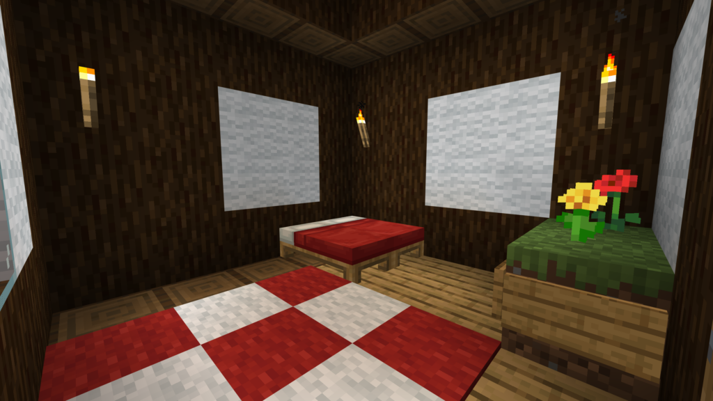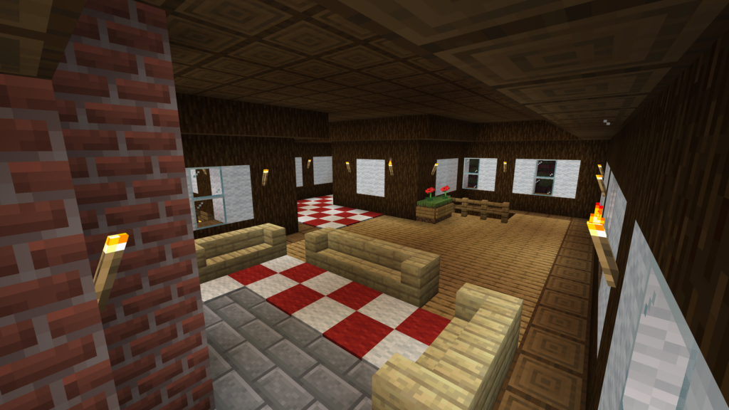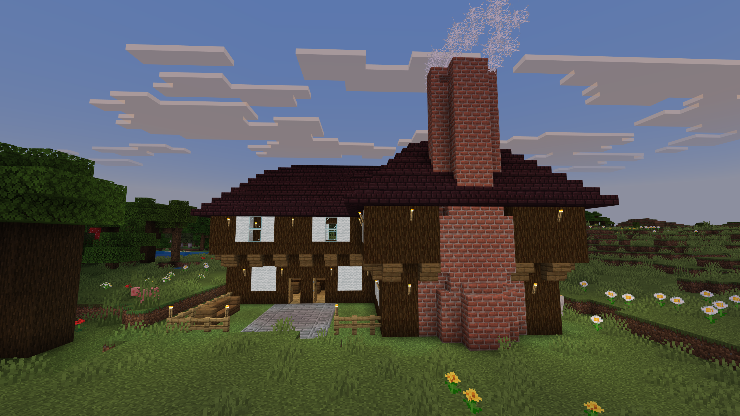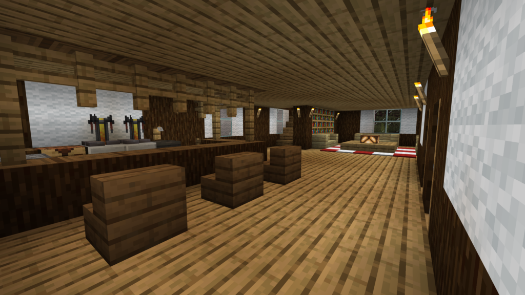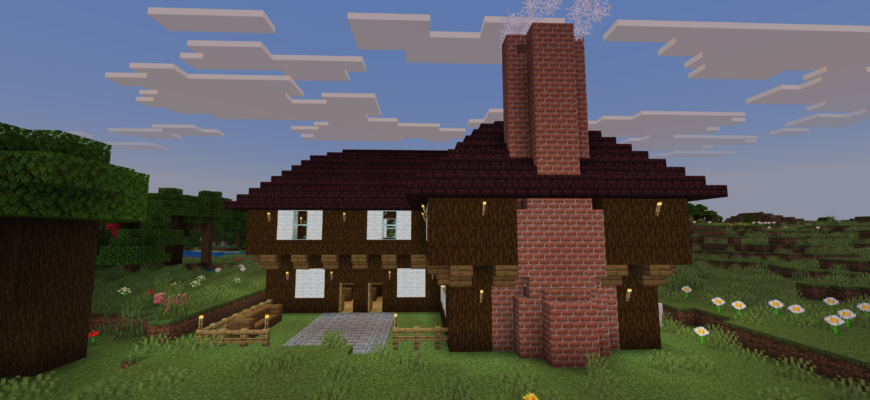 Постройка выполнена преимущественно из деревянных материалов, что добавляет ей уюта и тепла, который понравится игрокам Майнкрафта на телефоне.