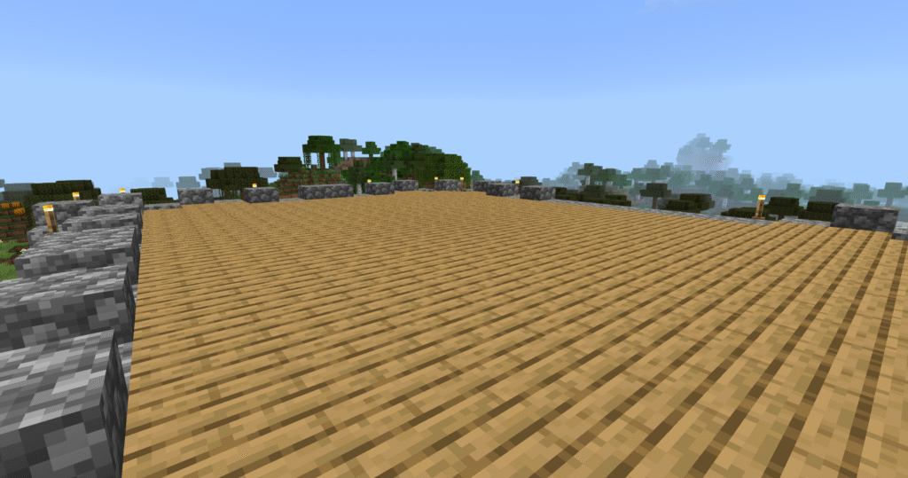 Постройка выполнена из разнообразных материалов, таких как: дерево, доски, булыжник, каменные кирпичи, крашенная шерсть и факела для освещения.