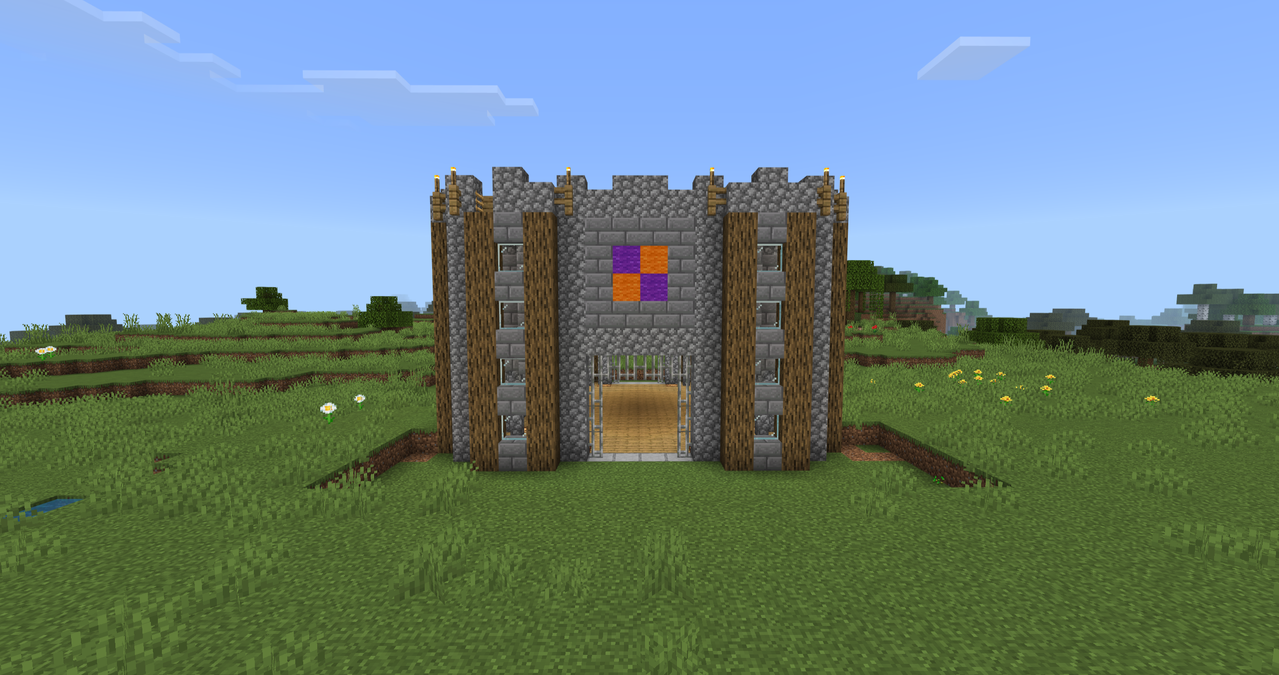 Постройка выполнена из разнообразных материалов, таких как: дерево, доски, булыжник, каменные кирпичи, крашенная шерсть и факела для освещения.