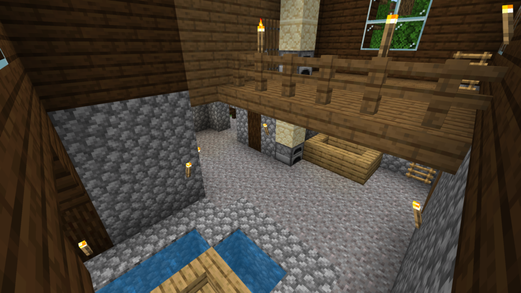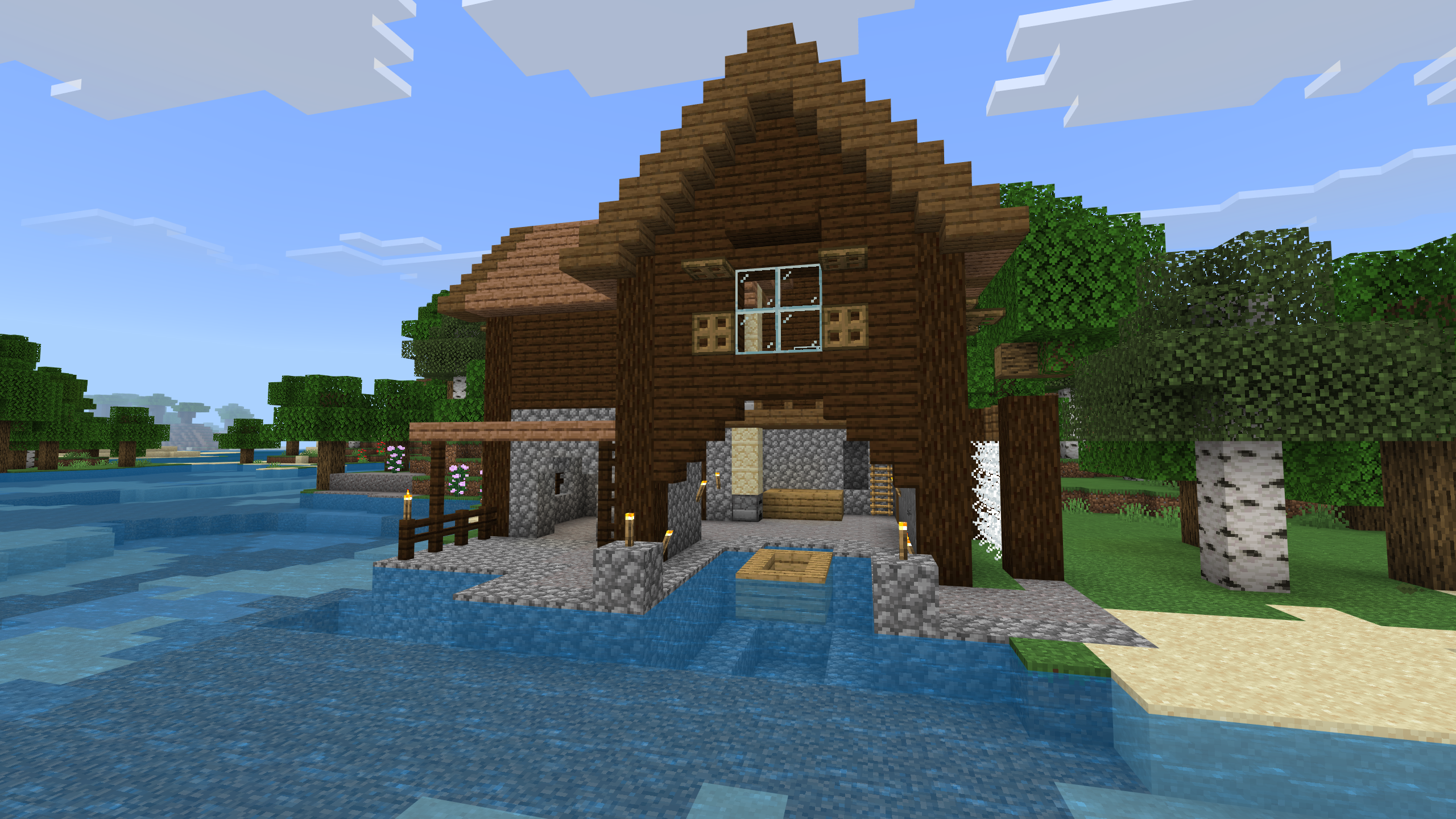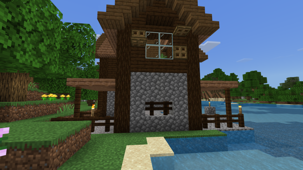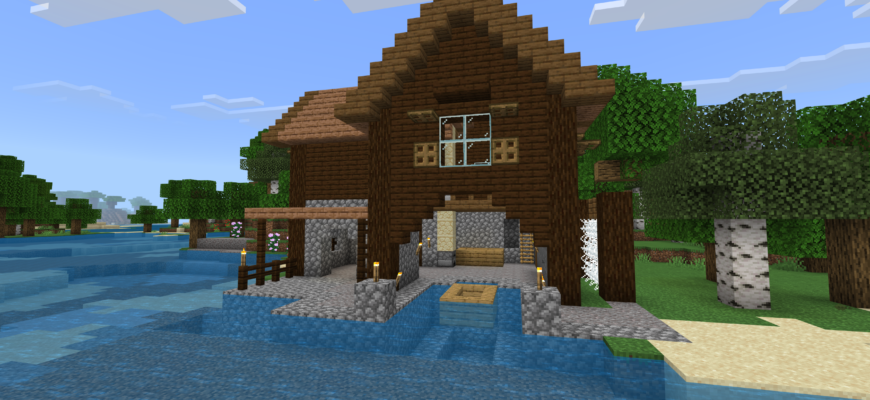 Постройка «Домик Рыбака» предлагает игрокам Майнкрафта на телефоне уютный домик, расположенный на берегу водоема. Здесь вы найдете все необходимые удобства для комфортного проживания: от печи и верстака до сундуков с запасами.