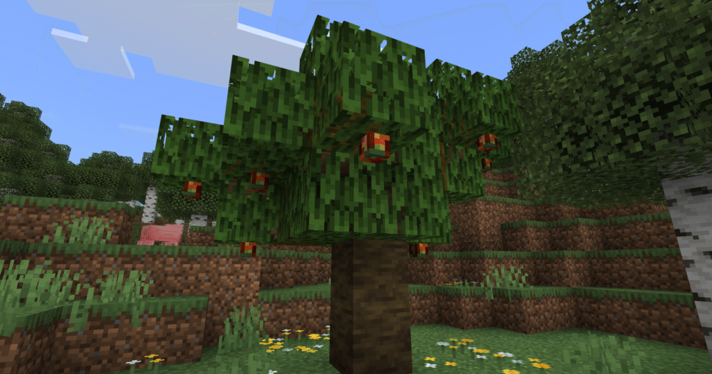 Мод «Фрукты на деревьях» добавляет в Майнкрафт на телефоне деревья, которые не только украшают мир, но и приносят полезные плоды, а так же новые крафты!