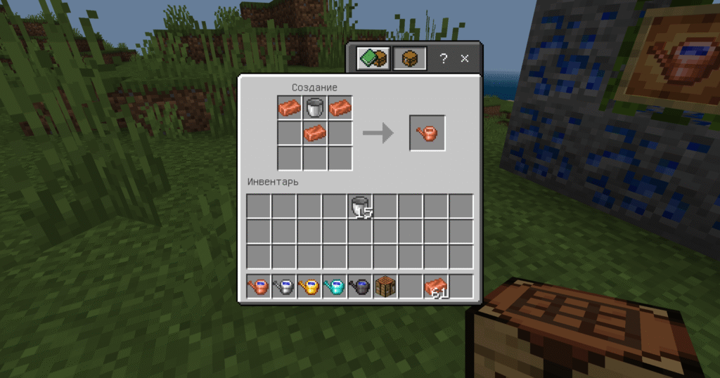 Для создания любой из видов леек, понадобится 3 слитка меди/незерита/алмазов и других ресурсов, а так же ведро.