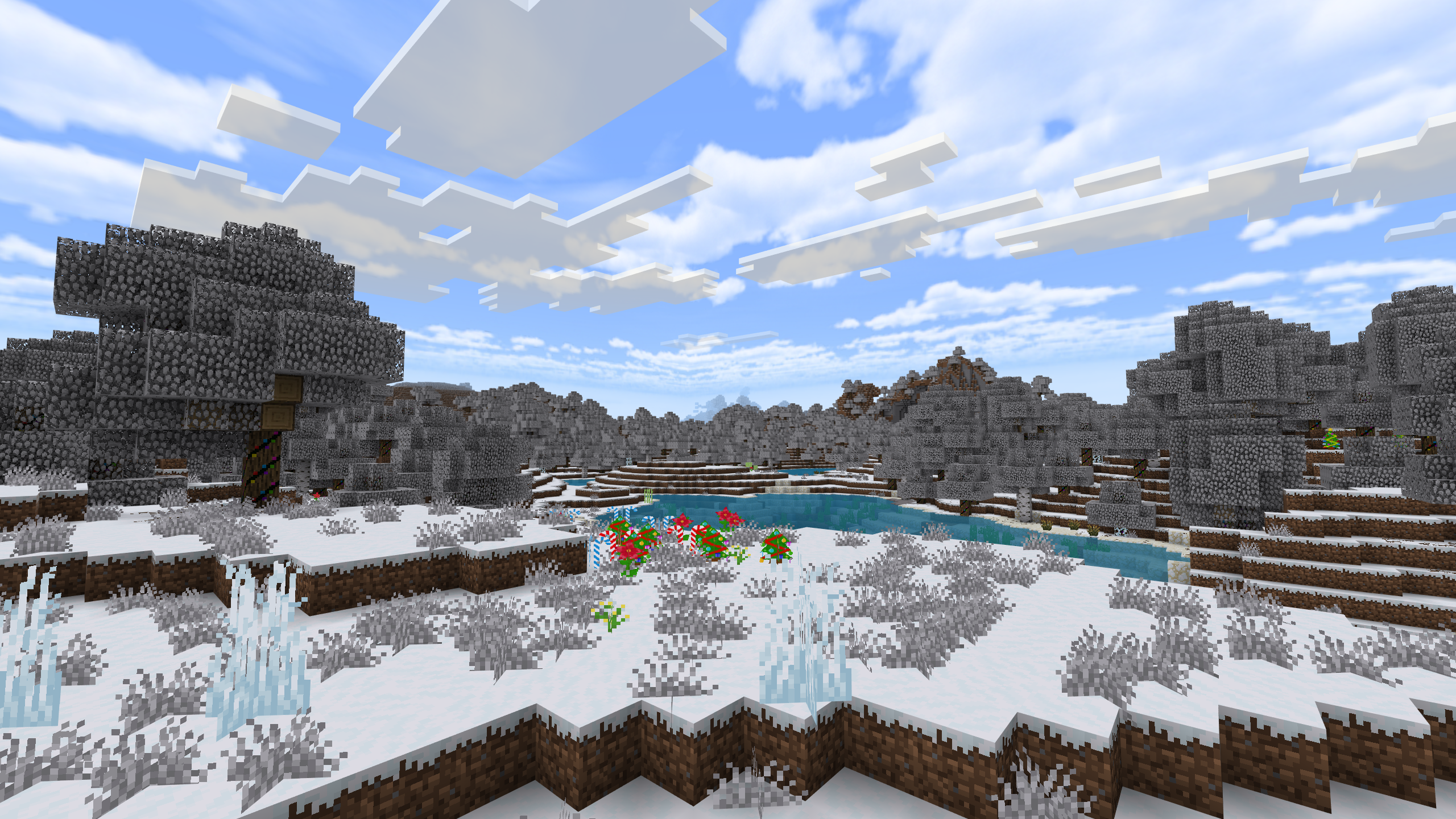 Этот пакет включает в себя множество праздничных текстур, от снежных блоков до елочных игрушек. Он идеально подходит для создания зимних сцен и рождественских деревень в Майнкрафт на телефоне.